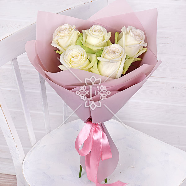 роза белая - 5 шт., упаковка, лента.
